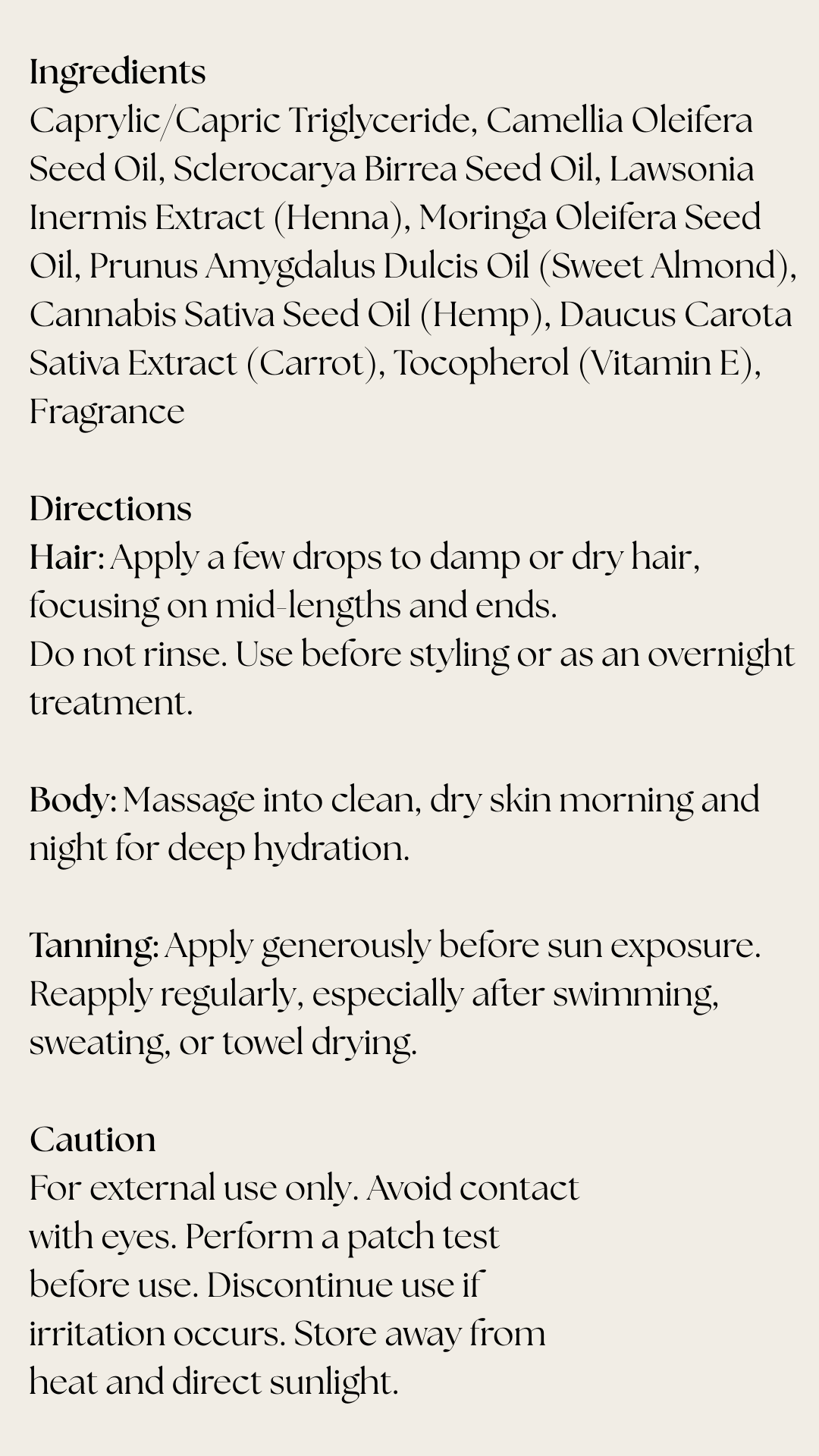 A lightweight dry oil for body, hair, and tanning. Infused with hemp and omega-rich oils, it smooths, nourishes, and supports a healthy glow as part of your daily ritual.